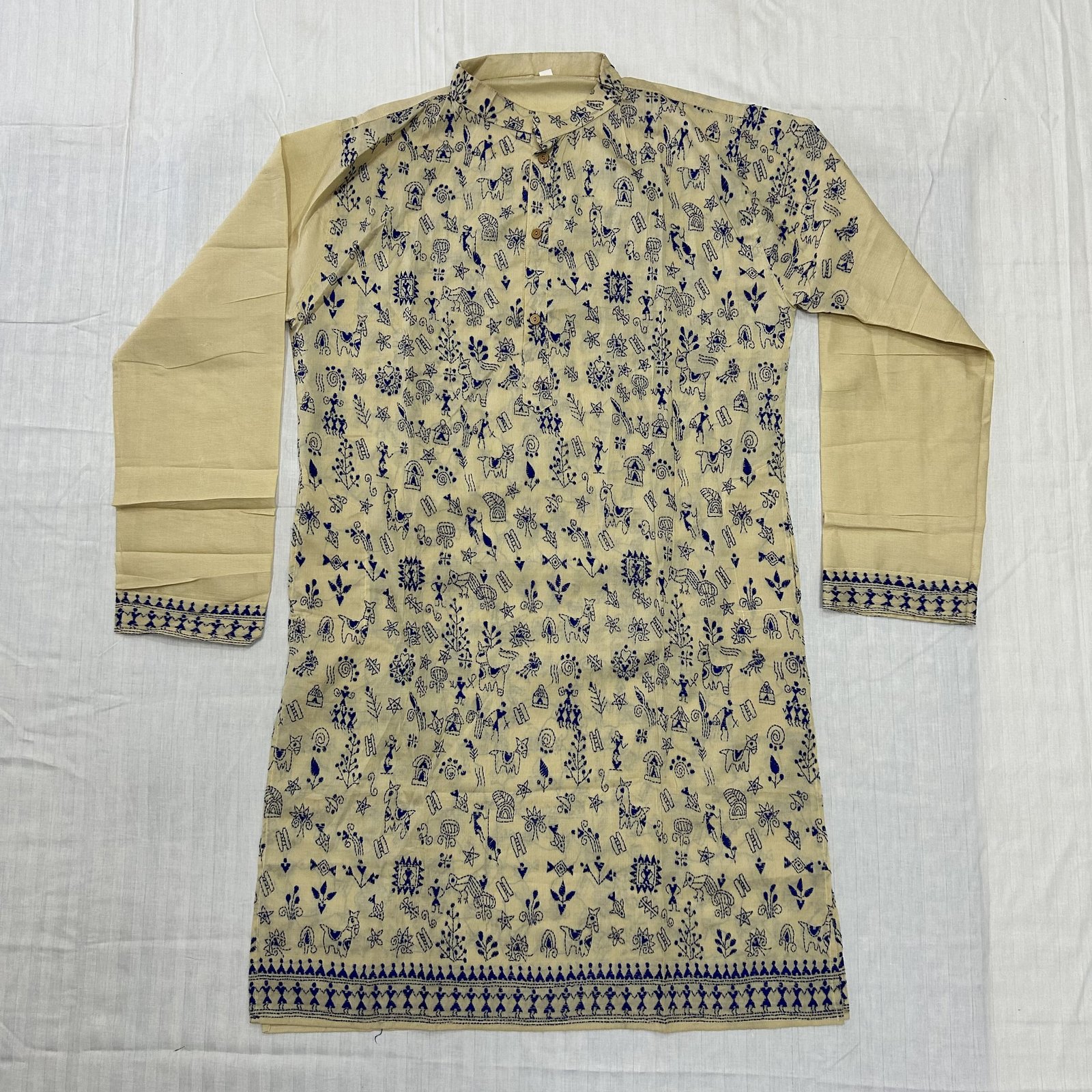Hand-Stitched Kantha Work Kurta for Men | 100% Tussar silk | Premium off white with blue tribal art design | K13